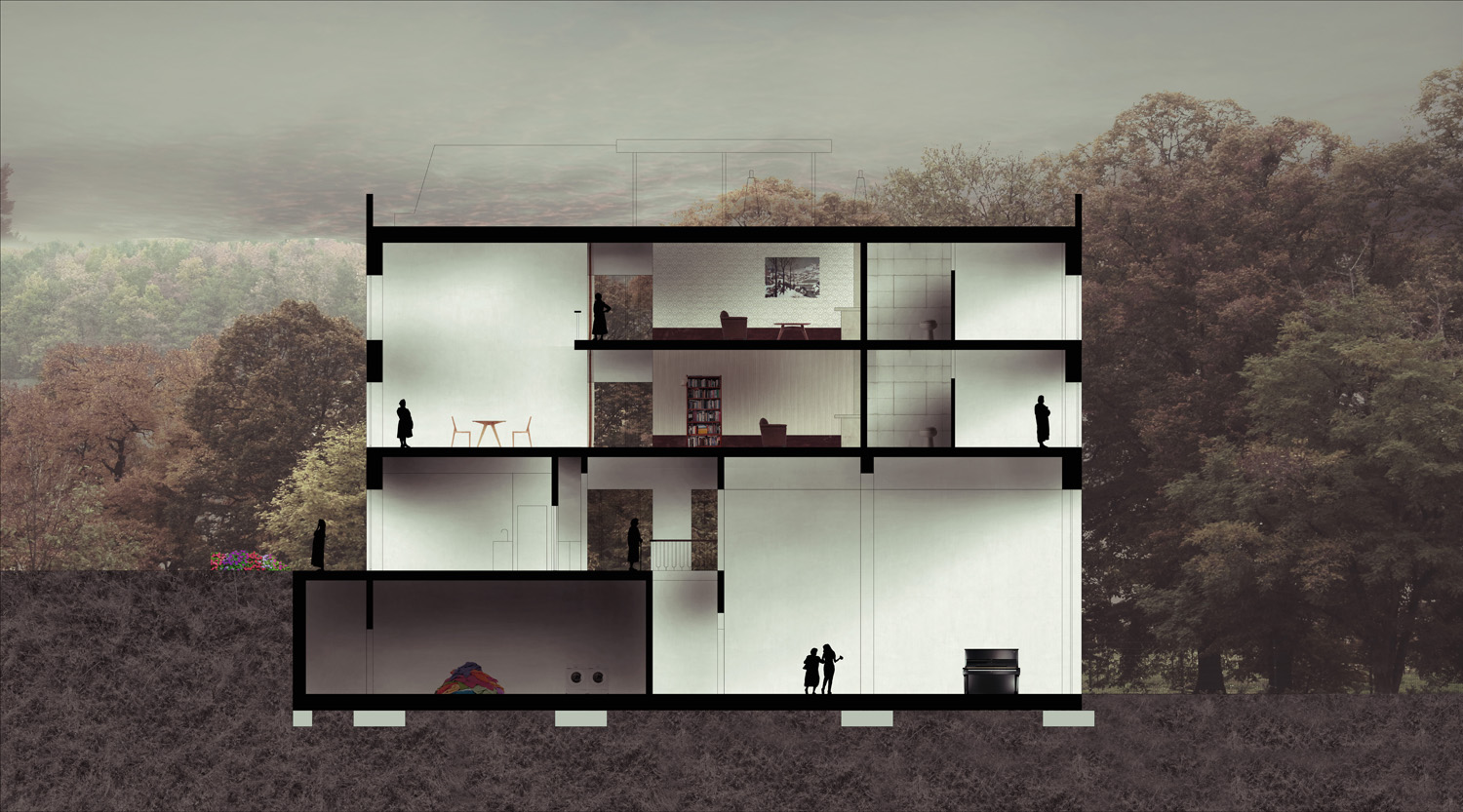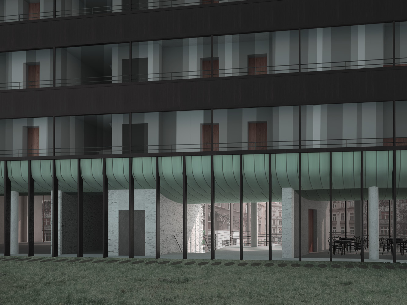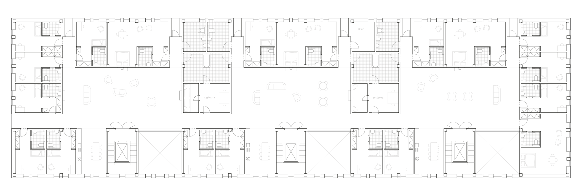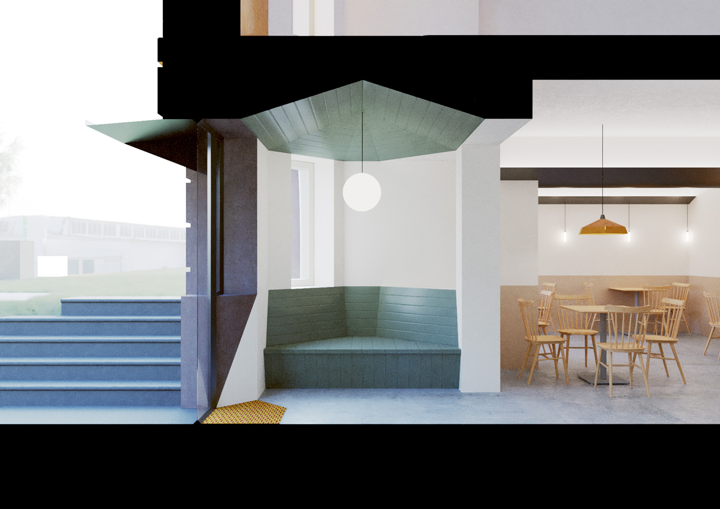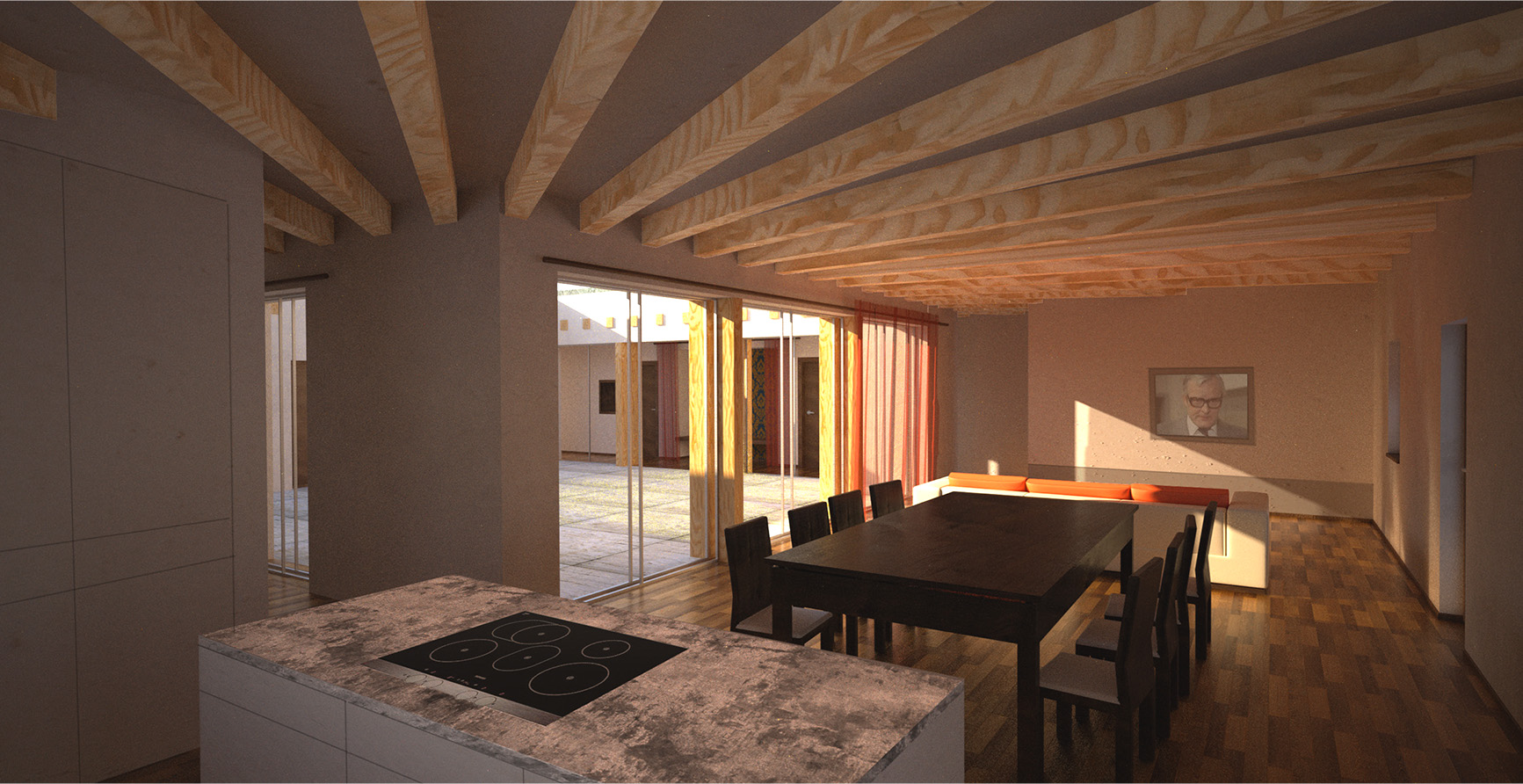Dům, který je celý mým domovem. Jakou obecnější ambici by měl mít starobinec? Čemu se ale podobá domov více než šedesáti lidských bytostí. Klíčem je analogizovat důvěrně známé součásti domova. Přenést ideu předsíně, pokoje, obýváku… Dbát na zachování jejich smyslu, jejich vzájemných vztahů. Reinterpretovat fenomén hloubky domova a vyvážit tak pocit bezpečí a kontakt s vnějškem.